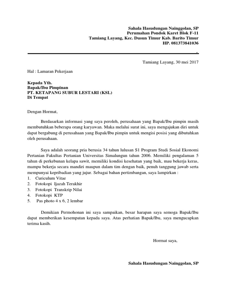 Kumpulan contoh surat lamaran kerja di pabrik kebun sawit.